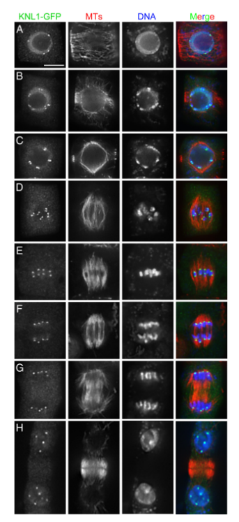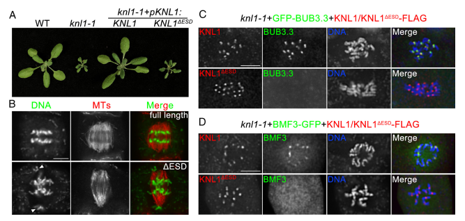 研究发现,KNL1是贯穿有丝分裂细胞分裂周期的动粒组成蛋白,该蛋白的缺失会直接导致有丝分裂过程发生错误:一些染色体位于纺锤极附近,而其他染色体已经在中期板上对齐;形成不同大小的微核并与较大的子核分离。进一步的研究表明,纺锤体组装检查点成员BUB3.3和BMF3与KNL1 N端的双子叶特定区域(ESD)相互结合而发生互作。此外,还发现在拟南芥KNL1启动子的控制下,双子叶植物番茄的KNL1同源物能在一定程度上恢复knl1-1突变体的功能,而早期陆生植物苔藓以及单子叶植物水稻的同源物则不能。