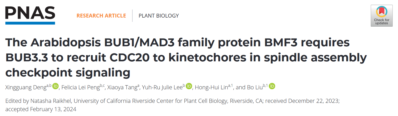 近日,tyc5997太阳集团林宏辉教授课题组与加州大学戴维斯分校柳波教授课题组合作在PNAS发表了题为“The Arabidopsis BUB1/MAD3 family protein BMF3 requires BUB3.3 to recruit CDC20 to kinetochores in spindle assembly checkpoint signaling”的研究论文。这项研究揭示了非经典的BUB3.3蛋白在植物SAC中的关键作用。