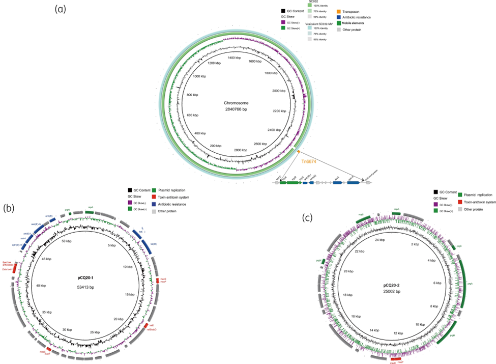 该研究选择猪源耐利奈唑胺粪肠球菌CQ20作为膜囊泡(Membrane Vesicles,MVs)的供体菌株,选择人源利奈唑胺敏感粪肠球菌SC032、屎肠球菌BM4105和大肠杆菌作为受体菌株。通过WGS或PCR证明了CQ20、MVs和获得ARGs的囊泡转化子中存在质粒(pCQ20-1和pCQ20-2)和携带optrA耐药基因的转座子Tn6674,并成功实现了CQ20-MVs中的质粒pCQ20-1和pCQ20-2以及转座子Tn6674向粪肠球菌SC032和屎肠球菌BM4105中的转移,但不能向大肠杆菌中转移,进而证明了粪肠球菌MVs可以介导ARGs从动物源性肠球菌转移到人源性肠球菌,而无法从革兰氏阳性菌转移到革兰氏阴性菌这一结论。同时实验也证明了通过囊泡获得ARGs的囊泡转化子仍然能够通过MVs继续传播这些ARGs。该研究为MVs在肠球菌中介导耐药基因的传播提供了新证据。